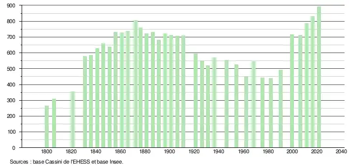 L'évolution du nombre d'habitants est connue à travers les recensements de la population effectués dans la commune depuis 1800. Pour les communes de moins de 10 000 habitants, une enquête de recensement portant sur toute la population est réalisée tous les cinq ans, les populations légales des années intermédiaires étant quant à elles estimées par interpolation ou extrapolation[13]. Pour la commune, le premier recensement exhaustif entrant dans le cadre du nouveau dispositif a été réalisé en 2006[14].