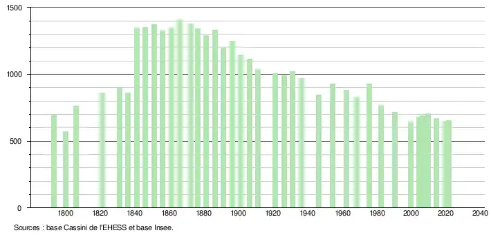 L'évolution du nombre d'habitants est connue à travers les recensements de la population effectués dans la commune depuis 1793. Pour les communes de moins de 10 000 habitants, une enquête de recensement portant sur toute la population est réalisée tous les cinq ans, les populations légales des années intermédiaires étant quant à elles estimées par interpolation ou extrapolation[30]. Pour la commune, le premier recensement exhaustif entrant dans le cadre du nouveau dispositif a été réalisé en 2004[31].