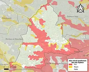 Le retrait-gonflement des sols argileux est susceptible d'engendrer des dommages importants aux bâtiments en cas d’alternance de périodes de sécheresse et de pluie[21]. 41,7 % de la superficie communale est en aléa moyen ou fort (91,8 % au niveau départemental et 48,5 % au niveau national)[22]. Depuis le , en application de la loi ELAN, différentes contraintes s'imposent aux vendeurs, maîtres d'ouvrages ou constructeurs de biens situés dans une zone classée en aléa moyen ou fort[Note 2],[23].
