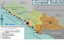 Depuis la réforme de 1961, à la ville même de Sotchi se sont rajoutées trois subdivisions suburbaines (raïons regroupant eux-mêmes des microraïons), Lazarevskoïe, Adler et Khosta, en plus du raïon central recoupant le centre-ville. L'entité du « Grand-Sotchi » s'étire sur 145 kilomètres de côtes[3]. Le Grand Sotchi s'étale de la rivière Chepsi au nord-ouest, jusqu'à la rivière Psoou qui marque la frontière avec la Géorgie. Les pistes de l'aéroport international de Sotchi à Adler longent la rivière Mzymta avant qu'elle se jette dans la mer Noire.