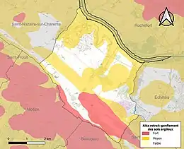 Le retrait-gonflement des sols argileux est susceptible d'engendrer des dommages importants aux bâtiments en cas d’alternance de périodes de sécheresse et de pluie. 64,3 % de la superficie communale est en aléa moyen ou fort (54,2 % au niveau départemental et 48,5 % au niveau national). Sur les 886 bâtiments dénombrés sur la commune en 2019, 559 sont en aléa moyen ou fort, soit 63 %, à comparer aux 57 % au niveau départemental et 54 % au niveau national. Une cartographie de l'exposition du territoire national au retrait gonflement des sols argileux est disponible sur le site du BRGM[22],[Carte 2].