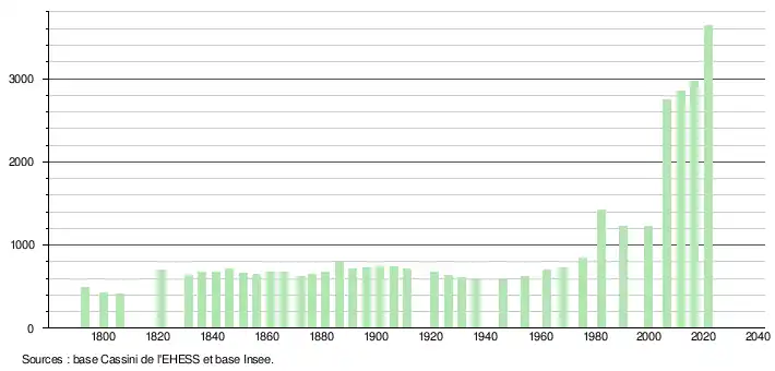 L'évolution du nombre d'habitants est connue à travers les recensements de la population effectués dans la commune depuis 1793. Pour les communes de moins de 10 000 habitants, une enquête de recensement portant sur toute la population est réalisée tous les cinq ans, les populations légales des années intermédiaires étant quant à elles estimées par interpolation ou extrapolation[43]. Pour la commune, le premier recensement exhaustif entrant dans le cadre du nouveau dispositif a été réalisé en 2006[44].