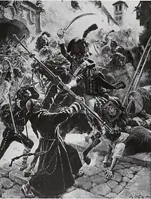 Mais encore une fois, l'héroïque défense parvint à repousser les Westphaliens. Voulant en finir, Lefranc lança deux bataillons qui chargèrent les insurgés à la baïonnette. Cette fois, les Espagnols furent enfoncés. Daoiz et Velarde furent tués, ainsi que nombre de leurs hommes, tandis que d'autres étaient fait prisonniers.