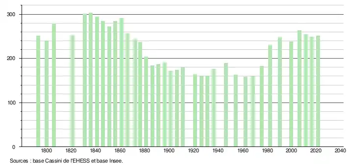 L'évolution du nombre d'habitants est connue à travers les recensements de la population effectués dans la commune depuis 1793. Pour les communes de moins de 10 000 habitants, une enquête de recensement portant sur toute la population est réalisée tous les cinq ans, les populations légales des années intermédiaires étant quant à elles estimées par interpolation ou extrapolation[24]. Pour la commune, le premier recensement exhaustif entrant dans le cadre du nouveau dispositif a été réalisé en 2006[25].