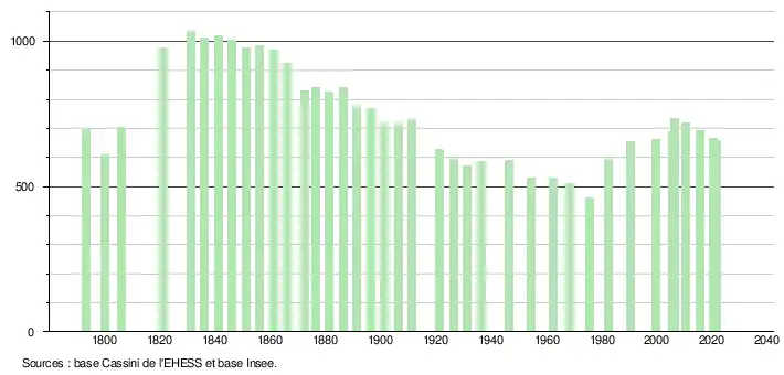 L'évolution du nombre d'habitants est connue à travers les recensements de la population effectués dans la commune depuis 1793. Pour les communes de moins de 10 000 habitants, une enquête de recensement portant sur toute la population est réalisée tous les cinq ans, les populations légales des années intermédiaires étant quant à elles estimées par interpolation ou extrapolation[17]. Pour la commune, le premier recensement exhaustif entrant dans le cadre du nouveau dispositif a été réalisé en 2005[18].