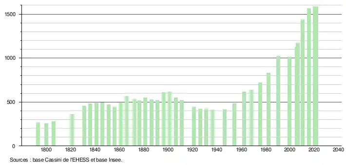 L'évolution du nombre d'habitants est connue à travers les recensements de la population effectués dans la commune depuis 1793. Pour les communes de moins de 10 000 habitants, une enquête de recensement portant sur toute la population est réalisée tous les cinq ans, les populations légales des années intermédiaires étant quant à elles estimées par interpolation ou extrapolation[41]. Pour la commune, le premier recensement exhaustif entrant dans le cadre du nouveau dispositif a été réalisé en 2005[42].