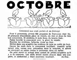 « dressez le bouillon dans la soupière pochez-y autant d'œufs que vous avez de personnes à servir, qu'ils restent tous entiers, jetez y quelques grains de sel, couvrez et mettez sur des cendres chaudes, jusqu'à ce que le blanc des œufs ait consistance et que le jaune reste mollet. »