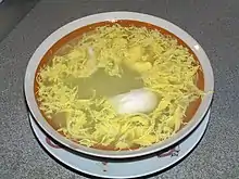 L'avgolemono est une soupe grecque (avec équivalent en cuisine juive et des Balkans) où c'est un mélange jaune d'œuf et jus de citron qui est versé et cuit dans le bouillon.