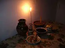 Le repas (en lituanien : kūčios, polonais : wigilia ou wieczerza wigilijna, ukrainien : cвята вечеря, sviata vetcheria) se compose de douze plats sans viande[1]. Ce nombre, selon les ethnologues, peut symboliser soit les mois de l'année, soit les douze disciples choisis par Jésus de Nazareth[2].
