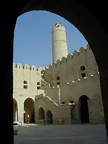 Le ribat a vu le jour durant le règne de la dynastie des Aghlabides (821) mais, après l'édification des murs de la ville en 859[18], perdit peu à peu sa fonction militaire. Alors qu'à l'étage se trouve une petite mosquée, le sous-sol est aménagé en divers locaux et magasins alors que des traces d'une presse à olives subsistent. L'imposante entrée flanquée de deux piliers de style corinthien est conçue comme une double porte, ce qui permettait de bloquer l'accès à la forteresse. Quant à la kasbah, elle se situe dans la partie la plus haute de la médina et date de l'année 844[18].