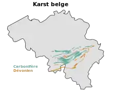 Le karst belge se situe dans la partie sud du pays, en Wallonie. Il est composé de calcaires du Dévonien moyen (grottes de Han, grottes de Hotton, grotte de Rochefort, grottes de Remouchamps) et du Dinantien. À cause du manque de relief et de la nature tourmentée du sous-sol (plissement hercynien) entaillé par les cours d'eau (Meuse, Lesse, Ourthe, Amblève et Vesdre), le développement des cavités belges est limité. La plus profonde atteint 140 mètres, le trou Bernard (y compris la zone noyée) et la plus longue, un peu plus de 10 kilomètres, les grottes de Han à Han-sur-Lesse dans le massif de Boine.