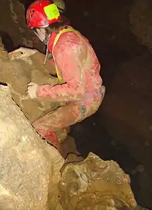 - précédemment les spéléologues utilisaient une pontonnière[Note 1] en latex mais la fragilité, le risque de remplissage et le maintien de l'humidité due à la transpiration font que son usage devient rare.