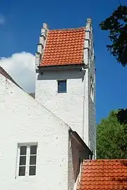 Le bâtiment est flanqué à l'est d'une tour possédant une étroite toiture en bâtière enserrée entre deux pignons à gradins.