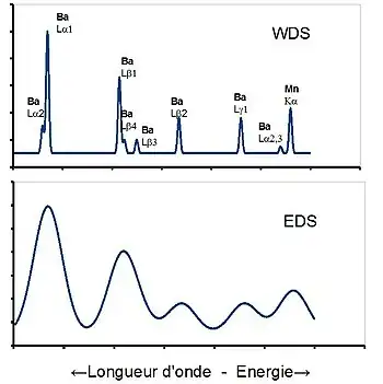 La résolution spectrale de l'EDS est donc beaucoup moins bonne que celle de la spectrométrie WDS, comme le montre la figure où sont représentés deux spectres EDS et WDS du même échantillon. Il existe beaucoup d'applications qui ne requièrent pas une très haute résolution spectrale. La moins bonne résolution de l'EDS est compensée par la possibilité inhérente de mesurer tout le spectre simultanément.