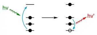 L'atome est alors dans un état excité mais la perte d'un électron a rendu la structure électronique de l'atome instable. La désexcitation se fait par une transition électronique : un électron d'un niveau plus élevé « descend » pour occuper la case quantique à moitié vide (place laissée vacante par le photoélectron, c'est-à-dire par l'électron éjecté par effet photoélectrique). Cette transition électronique libère l'énergie correspondant à la différence d'énergie des niveaux impliqués, soit par l'émission d'un photon X, soit en transmettant l'énergie à un des électrons atomiques. Le premier cas correspond à la fluorescence X, le second à l'émission Auger, les deux processus étant en compétition.