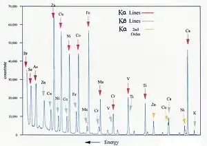Le spectromètre de Moseley est cependant limité par le faible rendement des tubes de l'époque[6]. - En 1922, Hadding, pour la première fois utilise la fluorescence X pour l'analyse de minéraux. Le spectre du rayonnement X représente une signature de l'élément chimique qui l'a émis beaucoup plus précise que les spectres obtenus dans le visible.