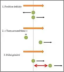 Une autre des principales limitations de l’instrument est la vitesse initiale de l’analyte lorsqu’il est introduit dans l’appareil. Au moment de l’injection, le mouvement brownien implique que les particules peuvent aller dans n’importe quelle direction ; la vitesse initiale d'une particule peut donc être opposée au sens de l’instrument. Une fois à l’intérieur des champs électrostatique de l’instrument, ce genre de particules voit sa vitesse dans la « mauvaise » direction diminuer et accélère pour aller dans la bonne direction (Figure 2, 2.). Cet évènement, également appelé le « turn around time », a pour conséquence que pour deux molécules possédant les mêmes caractéristiques, l’une d’entre elles peut aller de la direction opposée au trajet prévu et revenir ensuite. Le temps pris par la particule pour effectuer ce détour avant de se déplacer dans la bonne direction génère un délai, de sorte qu’au moment de détecter la molécule, le pic obtenu est plus large qu’il ne le devrait (Figure 2, 3). L’élargissement des pics est un problème puisque cela peut diminuer la résolution de l’instrument[1]. Cela est un problème dans le mode MS/MS mais pas dans le mode MS, puisque la haute résolution du TOF permet une séparation suffisante. Par contre, en MS/MS on ne peut pas savoir à quel analyte correspond chaque pic du spectre puisque les spectres sont superposés.