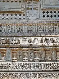 Au-dessus de la bande de paons (près de deux cents sculptures) se trouvent des représentations de la vie du peuple et de divinités de petite taille qui entourent seulement la "sabha mandapa" du temple principal. La plupart sont endommagées et certaines sont difficiles à identifier[26].