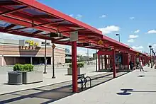 À l'extérieur, quatre quais d'autobus sont disposés sur un îlot central. Les passagers bénéficient d'une marquise vitrée pour se protéger des intempéries, de même que quatre abribus[1].