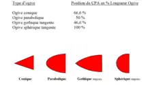 Le point d’application de la portance normale que génèrent les ogives est donné par la Théorie des corps élancés. Ce point d'application dépend de la forme des ogives. Pour l'ogive conique de notre fusée type, il est situé au 2/3 de la longueur de cette ogive. On dit donc que le XCPA propre de l’ogive est aux 2/3 de sa longueur. Le tableau ci-contre donne le XCPA propre d’autres formes d’ogives (le XCPA propre d’une ogive étant mesuré depuis sa pointe avant)[n 11].