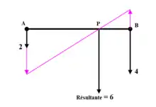 On peut aussi, si l'on désire éviter les calculs, utiliser la méthode de composition graphique des deux portances (image de droite composant deux forces de modules 2 et 4). Cette méthode graphique consiste à intervertir l'emplacement des deux forces en inversant l'une d'elles (ce qui donne la construction fuchsia). Le point d'application de la résultante (de module 6) est ainsi trouvé.