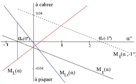 Partons d'une situation équilibrée et supposons qu'une perturbation fasse augmenter l'angle d'incidence , si le moment total devient négatif comme c'est le cas sur la figure 3, cela correspond à un moment total piqueur, qui réduit l'incidence générée par la perturbation et tend à la ramener à sa position d'équilibre initiale (le point de convergence , voir Fig. 3). Ainsi l'avion est stable si la variation de moment est de signe opposé à la variation d'incidence.