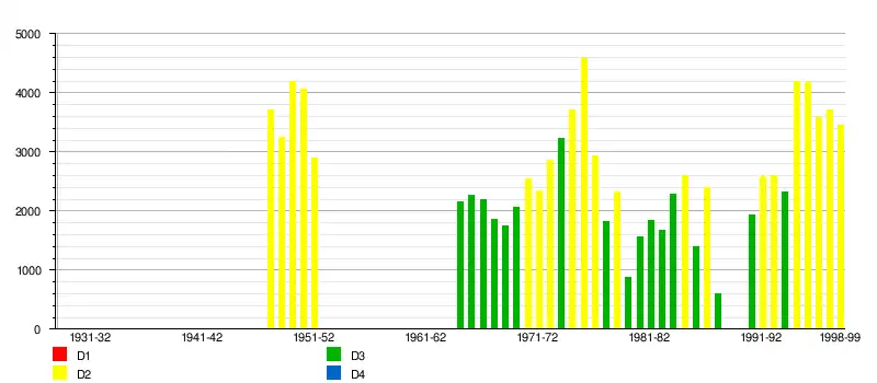 Une fois l'équipe professionnelle disparue, le stade Moulouguet n'accueille plus qu'entre 300 et 500 fidèles, mais une fois la section professionnelle retrouvée en 1945, il enregistre de nouveaux des affluences de 3 000 à 4 000 spectateurs[14]. Entre 1952 et 1991, sur la nouvelle période amateur du club, les affluences se stabilisent autour des 3 000 spectateurs en Division 2, et vers les 2 000 spectateurs quand le club évolue à l'échelon inférieur[14].