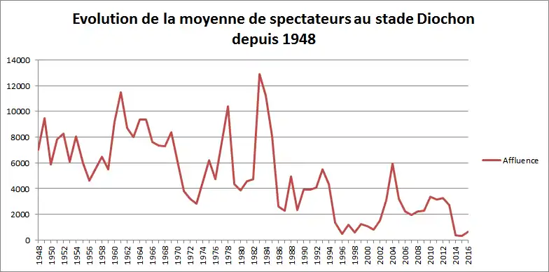 Les pics de la courbe de l'année 1994 et 2003 sont dus à la montée en ligue 2 du FC Rouen lors des saisons de 1993-1994 et 2003-2004.