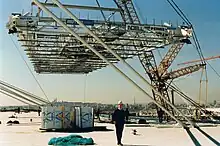 Le chantier commence le mais la pose de la première pierre a lieu le [9]. La construction du Stade de France a fait appel à la fois à des techniques de travaux publics (structures des gradins, haubans et ancrage du toit) et de bâtiment (locaux intérieurs, surfaces habitables sous les gradins, façades vitrées).