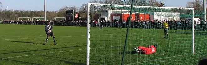 Plus spécifiquement, le Stade rennais FC conserve quelques liens avec la culture gallèse, propre au pays de Rennes. En 2012, le club soutient la défense du Gallo à travers la diffusion, avant ses matchs à domicile, de petits sketchs interprétés dans cette langue de Haute-Bretagne[139]. Produit culinaire spécifique au pays rennais, la galette-saucisse est également devenue un incontournable pour les supporters lors des matchs du Stade rennais FC[140]. Présente dans la plupart des marchés, fêtes de villages ou événements sportifs locaux, elle fait, depuis les années 1990, l'objet d'un chant de supporters, intitulé Galette-saucisse je t'aime. Adaptation d'une chanson de supporters marseillais dédiée au pastis, elle a depuis été adoptée par le club[141],[142].
