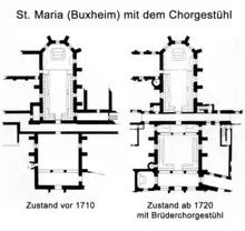 La transformation baroque de l’église a rendu obligatoire une première modification des stalles. Elles ont dû être démontées en 1709 pour être provisoirement entreposées. Le jubé gothique a été déplacé d’environ 2,40 m vers l’est, ce qui représente un raccourcissement du chœur liturgique et par là-même des stalles. Lors de la reconstruction, on renonça donc à cinq sièges, en réduisant nombre de stalles à douze sur le côté nord, et treize sur le côté sud. On perdit ainsi l’effet de symétrie architecturale entre les dorsaux nord et sud, symétrie que l’on peut encore observer dans les stalles de la chartreuse d'Ittingen, postérieures à celles de Buxheim[9]. On ignore quelles sculptures ornaient ces cinq stalles disparues.