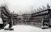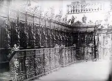 Le , les possessions du comte sont mises sous séquestre. Pour éviter une imminente liquidation judiciaire, le comte Hugo Philipp décide la vente aux enchères de tous les biens meubles appartenant à l’ancienne chartreuse. L'on disperse alors non seulement les stalles du chœur liturgique, mais aussi celles du chœur des frères, la bibliothèque, avec ses 16 800 livres, les autels, les tableaux, et les trésors d’orfèvrerie. Tous ces objets arrivent à Munich en . La vente des stalles a lieu le pour un prix de 41 100 marks, une adjudication bien au-dessous des espérances du vendeur. Le siège du célébrant reste dans l’église, seul le petit meuble attenant rapporte 700 marks. Les recherches sur l’identité de l’acquéreur des stalles, ainsi que sur leur lieu de conservation, sont restées vaines. Il est possible qu’elles soient parties en Hollande (bien que le fait ne soit attesté par aucun document), en vue d’une exposition à Amsterdam[12]. Une photographie des stalles, réalisée en 1886 à un emplacement inconnu, a été transmise en 1938 au Landesamt für Denkmalpflege par le musée de l’archevêché d’Utrecht.