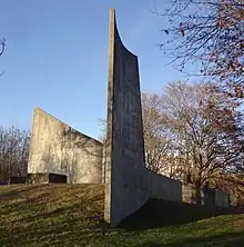 À l’entrée du site, sur une petite élévation, se trouve un monument constitué de plusieurs murs en béton, incurvés, imbriqués, avec une plaque de bronze portant cette citation de Paul Claudel : « Tout ce que le cœur désire peut toujours se réduire à la figure de l'eau » (Positions et propositions)[6].