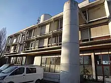 Les formes architecturales du bâtiment administratif dit « La Verseuse » ont d’autres similitudes avec les constructions de Le Corbusier de la même période : les pilotis qui le soutiennent, les brise-soleil qui donnent à la façade sa plastique et le toit à caractère sculptural. Ce bâtiment est situé sur une pente et compte six niveaux côté Rhône soutenus par des pilotis, et trois niveaux du côté de l’entrée. Le rez-de-chaussée est libre et vitré, il permet une vue traversante. Les brise-soleil délimitent les étages. Les escaliers sont insérés dans deux tours rondes qui renforcent la plastique générale. La salle de conférences située sur le toit s’ouvre sur le fleuve et un mur posé de biais est là spécialement pour accueillir une fresque[2]. Les matériaux utilisés sont principalement le béton (murs en béton brut, escaliers en béton bouchardé, dallettes pour les sols de l’entrée) ; le bois pour la barrière dans la tour d’escalier et pour les casiers dans les couloirs ; le linoleum pour les sols, « qui n’a pas bougé depuis cinquante ans »[2].