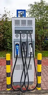 Pour la charge normale (3 kW), les constructeurs automobiles ont intégré un chargeur de batterie à la voiture. Un câble de recharge permet de le brancher sur le réseau électrique pour l'alimenter en courant alternatif 230 volts. Pour la charge plus rapide (22 kW, voire 43 kW et plus), les constructeurs ont retenu deux solutions :