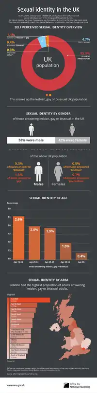 Selon une enquête auprès d'environ 10 000 répondants[35], l'IFOP estimait que 90 % des français étaient hétérosexuels, 3 % s'identifiaient comme bisexuels, et 4 % d'entre eux se considéraient eux-mêmes homosexuels. Deux pour cent disaient ne pas avoir adopté une définition de leur sexualité, et 1 % ne souhaitent pas répondre. Plus de femmes que d'hommes étaient hétérosexuels (93 % contre 86 %), tandis que plus d'hommes que de femmes s'identifient comme homosexuels (7 % contre 1 %) et, dans une moindre mesure, bisexuels (4 % contre 2 %). Une identité homosexuelle ou bisexuelle a été plus fréquente chez les personnes âgées de 18 à 49 (9 %) que chez celles âgées de 50 à 64 ans (6 %) ou de plus de 65 ans (4 %). Plus de célibataires que de gens en relation s'identifiaient comme des homo - ou bisexuels (11 % contre 6 %). Une identité LGB est également plus fréquente chez les personnes qui ont eu plus de 10 partenaires sexuels ou aucun par rapport à ceux qui ont eu des niveaux intermédiaires d'expérience sexuelle. Les catholiques sont plus susceptibles de s'identifier comme hétérosexuels (91 %) que les personnes qui ont dit avoir une autre religion ou aucune religion (88 % chacun)[36].