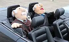 Statler (à droite) et Waldorf (à gauche) à bord d'une Mercedes W124 Classe E cabriolet.