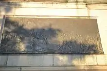 La statue est accompagnée de 3 bas-reliefs en bronze illustrant 3 périodes de la carrière de Cecil Rhodes :