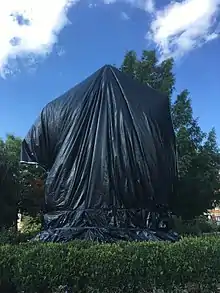 Le 23 août 2017, le conseil municipal fait couvrir la statue par une bâche noire en signe de deuil. Le 27 février 2018, la justice, considérant que la municipalité n'a jamais défini la durée du voilage, ordonne le retrait sous quinze jours de la bâche[9].