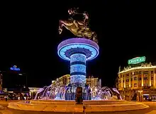 Le nom originel du monument était « statue d'Alexandre le Grand », mais à cause d'un conflit culturel avec la Grèce, les autorités l'ont rebaptisé de façon plus neutre.