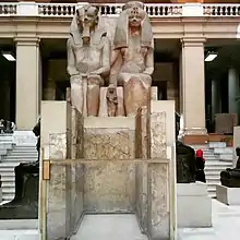 La statue colossale d'Amenhotep III et Tiyi est une statue de groupe monolithique représentant le pharaon égyptien Amenhotep III, sa grande épouse royale Tiyi, et trois de leurs filles. Il s'agit de la plus grande dyade connue jamais sculptée[5]. La statue se trouvait à l'origine à Médinet Habou, dans l'ouest de Thèbes ; aujourd'hui, elle est la pièce maîtresse de la salle principale du Musée égyptien du Caire.