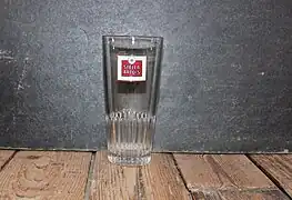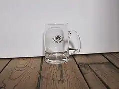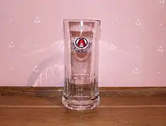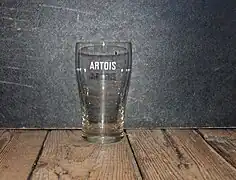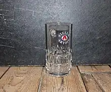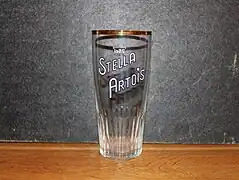 Vieux verre à bière "Stella Artois" avec écriture émaillée.