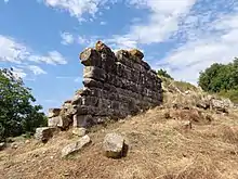 Le temple dédié à Zeus Strátios est situé dans la partie nord-ouest de l'enceinte fortifiée. Il est construit entre les périodes classique et hellénistique, à la fin du IVe siècle av. J.-C., et représente à bien des égards une période de transition dans l'architecture. Le temple est de type hexastyle périptère, mesurant environ 16,5 × 32,4 mètres. Il combine les trois styles grecs : son péristyle est de style dorique, son architecture de style ionique et son intérieur de style corinthien[2],[4],[7].