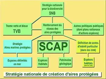 Elle a été précisée par l'article 23 de la loi Grenelle I (du ) qui vise “Une stratégie nationale de création d’aires protégées terrestres identifiant les lacunes du réseau actuel sera établie afin que 2 % au moins du territoire terrestre métropolitain soit placé dans les dix ans sous protection forte” . La SCAP est en cours (2012-2013) de déclinaison régionale[1].
