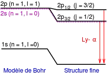 Le modèle prenant en compte les effets relativistes permet donc de corriger cette énergie, de lever partiellement la dégénérescence du niveau d'énergie et de séparer les raies spectrales.