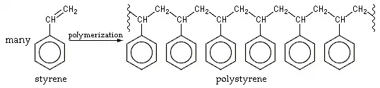 Le comportement du styrène vis-à-vis des réactions de polymérisation est assez inhabituel : il peut subir des polymérisations de type radicalaire, tout comme des polymérisations anioniques ou cationiques. Il peut ainsi copolymériser avec du chlorure de fer par polymérisation cationique. Le styrène seul polymérise par un mécanisme radicalaire pour former le polystyrène. Cette dernière réaction est initiée plus facilement en présence d'un catalyseur (plus exactement un initiateur dans le cas du polystyrène), de type peroxyde la plupart du temps.
