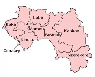 | Gouvernorat de Conakry | GN-C | ![]() Les 8 régions administratives de la Guinée |