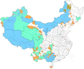 Bien que non-officiellement autonomes, quelques zones de niveau districtal possèdent une autonomie similaires. Au niveau cantonal, il existe également 270 cantons ethniques et 1 sum ethnique, mais qui ne sont pas considérés comme autonomes.