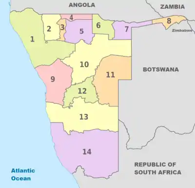 Depuis le , la Namibie est divisée administrativement en quatorze régions[1],[2] ; capitale entre parenthèses (les numéros correspondent à ceux de la carte) :