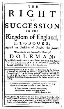 Un pas important est franchi dans le Traité de succession de Robert Highington, en faveur de la ligne passant par la maison de Portugal. La conférence pseudonyme de Robert Persons sur la prochaine succession à la couronne d'Angleterre, par R. Doleman (comprenant peut-être des co-auteurs, 1595), était contre la demande de James VI[22]. Il a cité les arguments de Highington, contre ceux de Hales et Sir Nicholas Bacon[31]. Ce travail a fait un effort apparent pour discuter équitablement des candidats, y compris l'infante d'Espagne, Isabella Clara Eugenia. Il a été pris par certains en Angleterre pour impliquer que la mort d'Elizabeth pourrait conduire à la guerre civile. Une préface suggérait que Robert Devereux, 2e comte d'Essex pourrait être une influence décisive. La circonstance a eu une mauvaise incidence sur l'Essex avec la reine[32]. Il cherchait également à saper Burghley en suggérant qu'il était un partisan d'Arbella Stuart et traitait avec acuité les problèmes Lancaster/York[33].